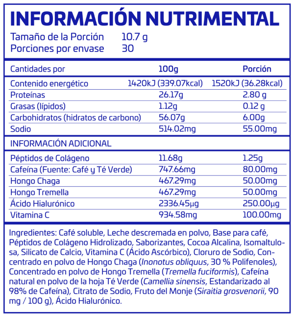 Nuestra mezcla exclusiva combina péptidos de colágeno para fortalecer y dar estructura, Tremella y ácido hialurónico para una hidratación profunda, y hongo Chaga para reforzar la resiliencia inmunológica. La vitamina C actúa como el activador esencial que ayuda a tu cuerpo a optimizar la absorción y producción de colágeno, mientras que los polifenoles naturales del café impulsan tu energía y metabolismo.El resultado es un ritual diario completo que potencia tu belleza, vitalidad y rendimiento desde el interior hacia afuera. No es solo café. Es Everyday ACTIVZ.